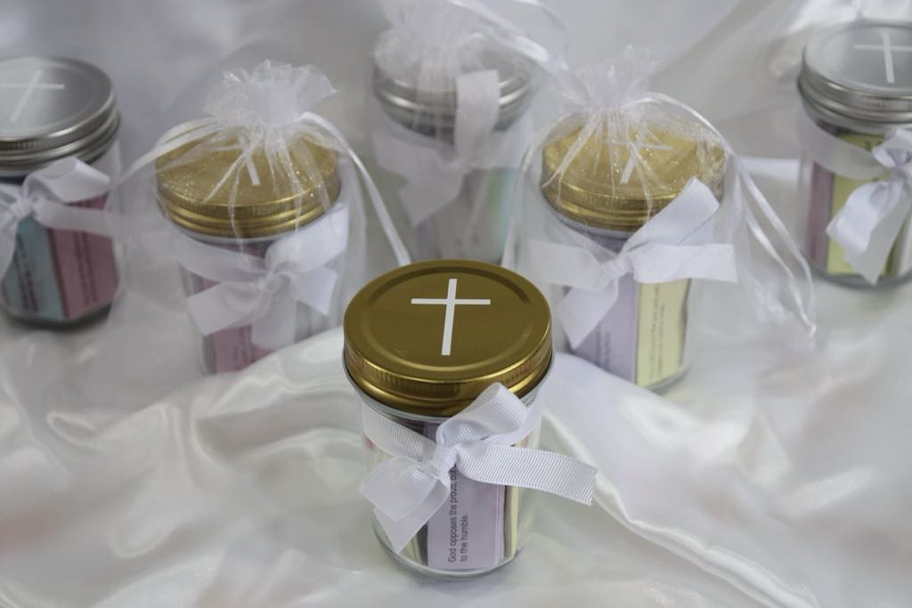 Each glass jar contains over 200 Bible verses, can be packaged and customised to suit your theme.